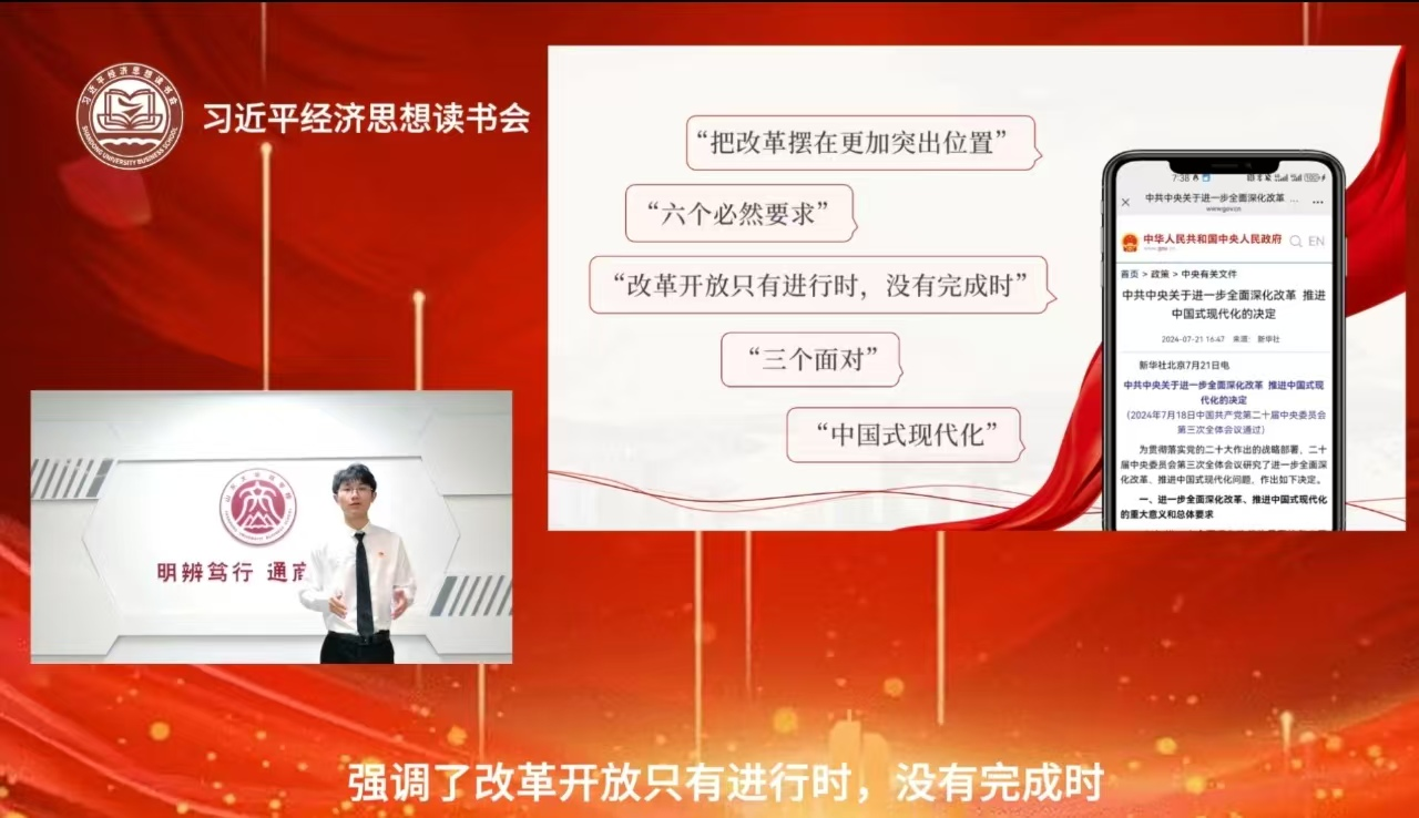 德润心田,校准思想“指南针”。擦亮“习近平经济思想读书会”商科品牌,开展6期旗帜鲜明的专题活动、4期实践调研、1期“经济思想微课堂”,绘制“理论学习—知行合一—价值传递”三维导航图。创新"研途榜样"引路机制,推出14期身边人讲身边事专栏,传递“见贤思齐”正能量。