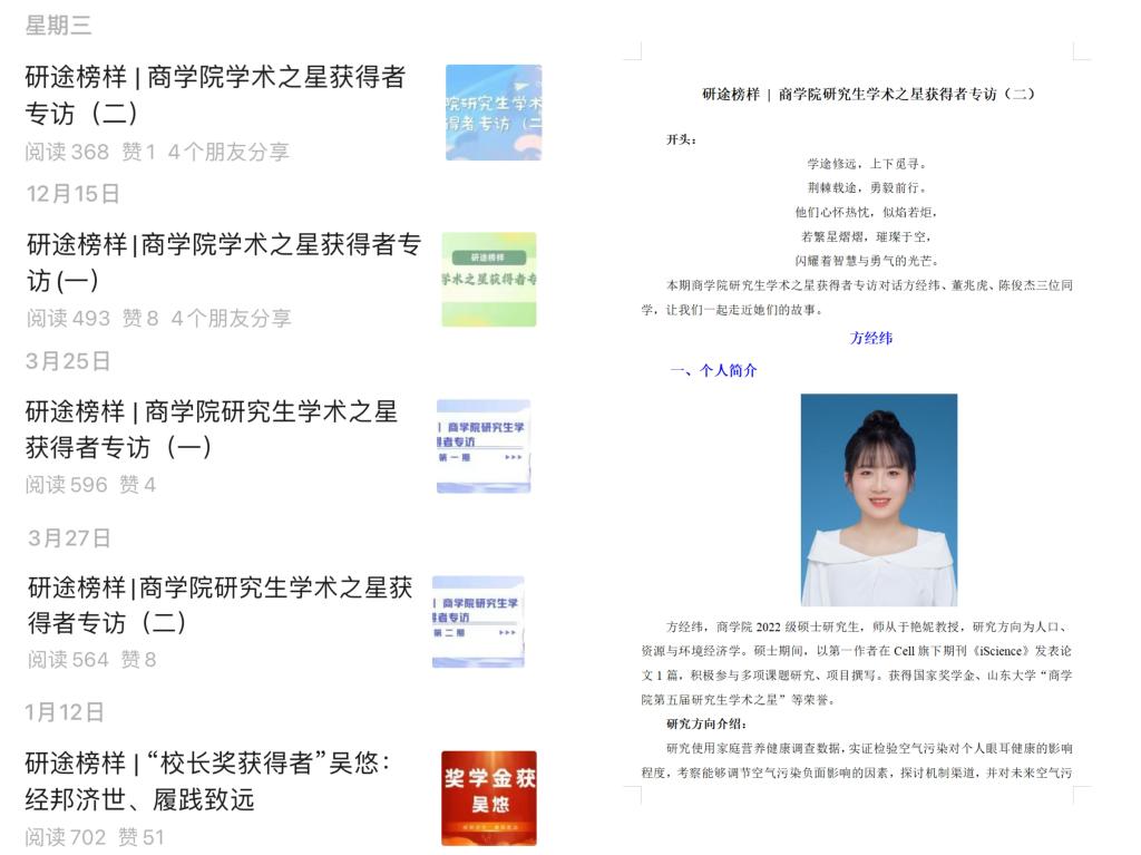 美浸校园,构筑文化“百花园”。组织参加“导学思政”研究生师生合唱比赛并蝉联一等奖。开展“一帧山大”摄影大赛,依托“SDU青春商研”公众号,发布推文58篇,在校新闻网与学院官网累计发布通讯53篇,线上线下联动,视听传播一体,培育文化高地。